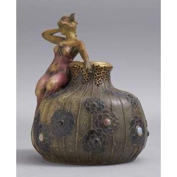 | Artist sgn. Riessner, #8157. Art Nouveau lady in pink dress, applied jewels. Excellent, no restorations. Ht. 17" Dia. 14". Est. $5,000-$8,000 |