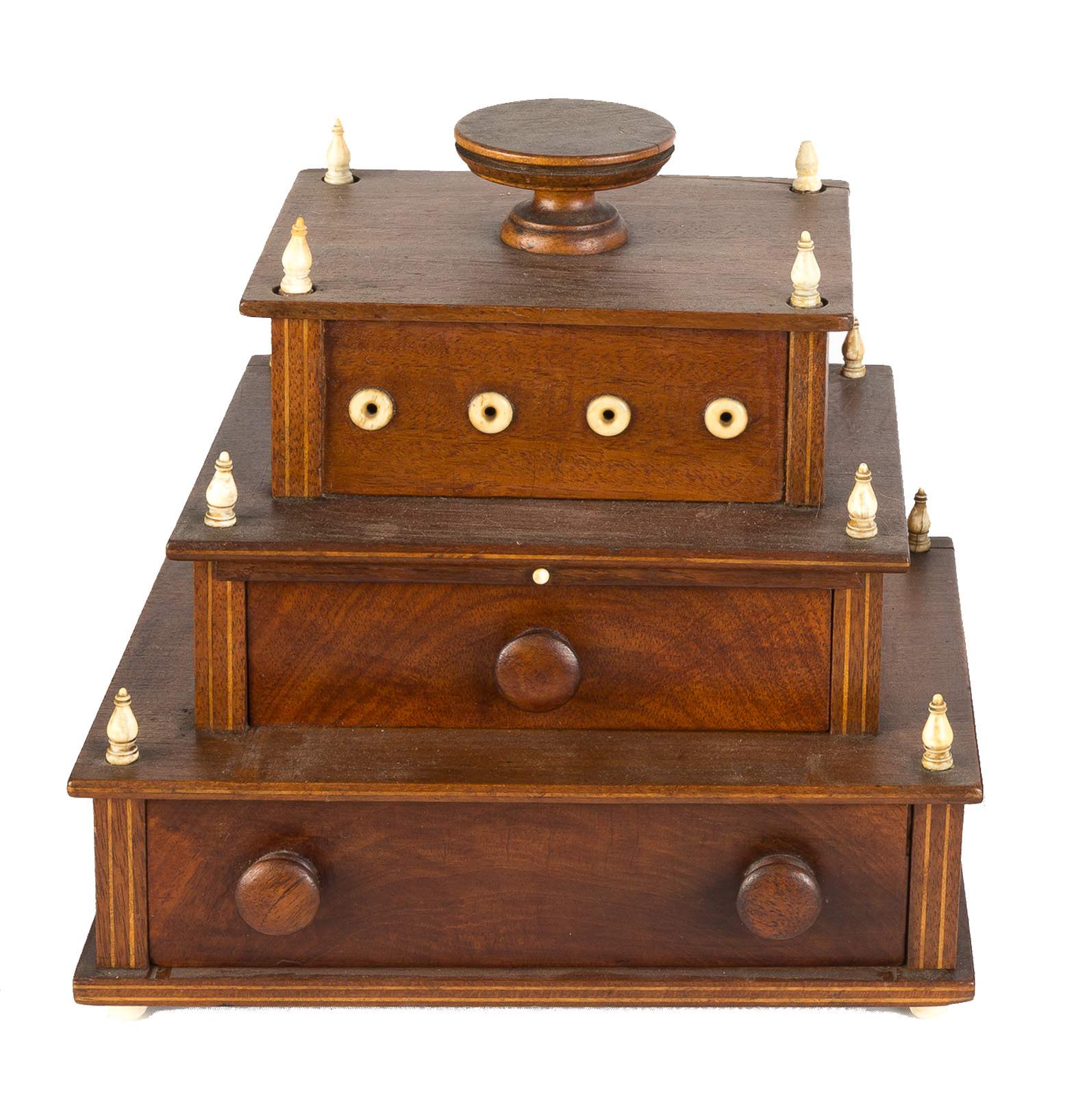 | Lot #: 38 19th Century Mahogany & Whale Bone Sewing Caddy |