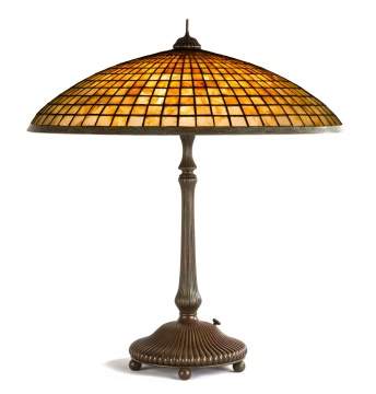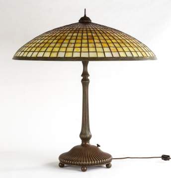 | Leaded glass & patinated bronze. circa 1910. shade impressed TIFFANY STUDIOS NEW YORK 1520. base impressed TIFFANY STUDIOS NEW YORK 28622 with Tiffany Glass & Decorating Company Monogram. Literature: Alastair Duncan, "Tiffany Lamps and Metalware" Ref. #303. |