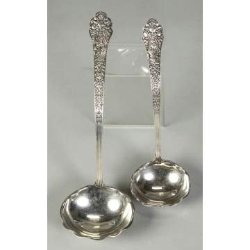 | 112 pcs., 147 ozt. Total, most monogrammed. 12 Dinner knives, 9 1/2"; 8 Serving Spoons, 8 1/4"; 10 Dinner forks, 7 1/2"; 8 Tablespoons, 7"; 9 Salad Forks, 6"; 6 Boullion, 6 3/4"; 6 Sm. Boullion, 5"; 24 Teaspoons, 5 3/4"; 8 Butter knives, 6 1/2"; 9 Serving pcs. & extras; 2 Carving set; 10 Enameled, etched bowls, teaspoons, 6". |