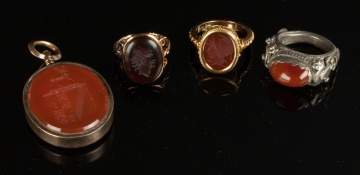 | Lot #: 46 Group of Gold & Hardstone Rings & Pendant |