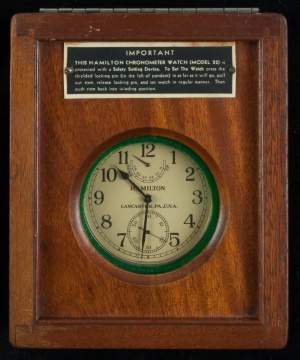 | Hamilton, Lancaster, PA, USA. Engraved on reverse Bureau of Ships U.S. Navy N7141 1942. Chronometer Watch, 21-jewel, stem-wind, pin-set movement, in a two-tier mahogany case. Payment must be made by cash, check, certified check, money order, or wire transfer. Purchases paid for using personal checks will be held until payment has cleared the bank (typically 5-7 business days). Non-US purchasers must make payment by wire transfer. |