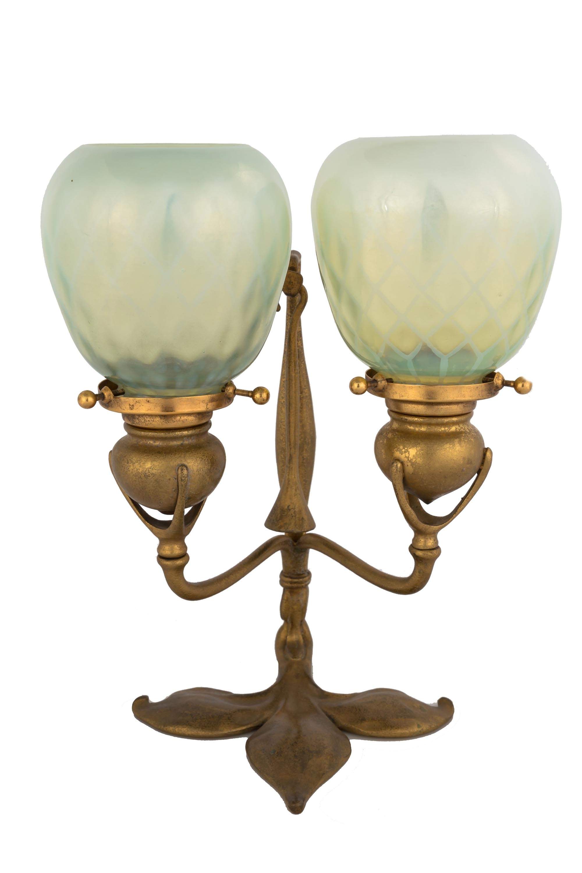 | #1232. Gold patina, with Favrile quilted shades inscribed L.C.T. Original candle snuffer. |