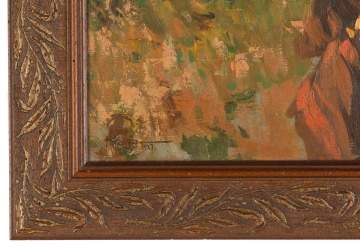 | Oil on mahogany panel. Carved and gilded frame. Signed 'F. Amorosolo' (lower left) dated 1927. |