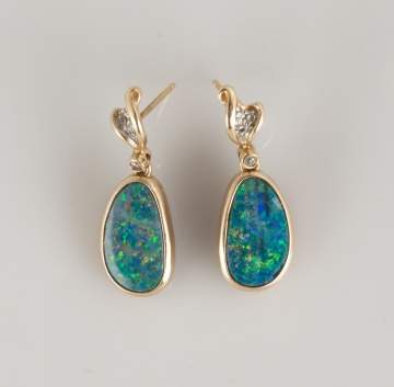 | Lot #: 101 Pair of 14K Gold, Opal and Diamond Drop Earrings |