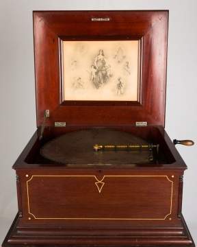 | circa 1900. (33) 15 1/2" disks. Inlaid mahogany case. |