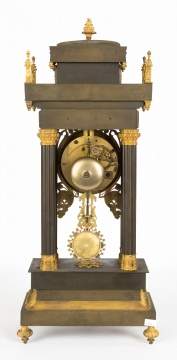 | Mid 19th century. Bronze and gilt bronze with silvered metal dial. 8 day time & strike. |