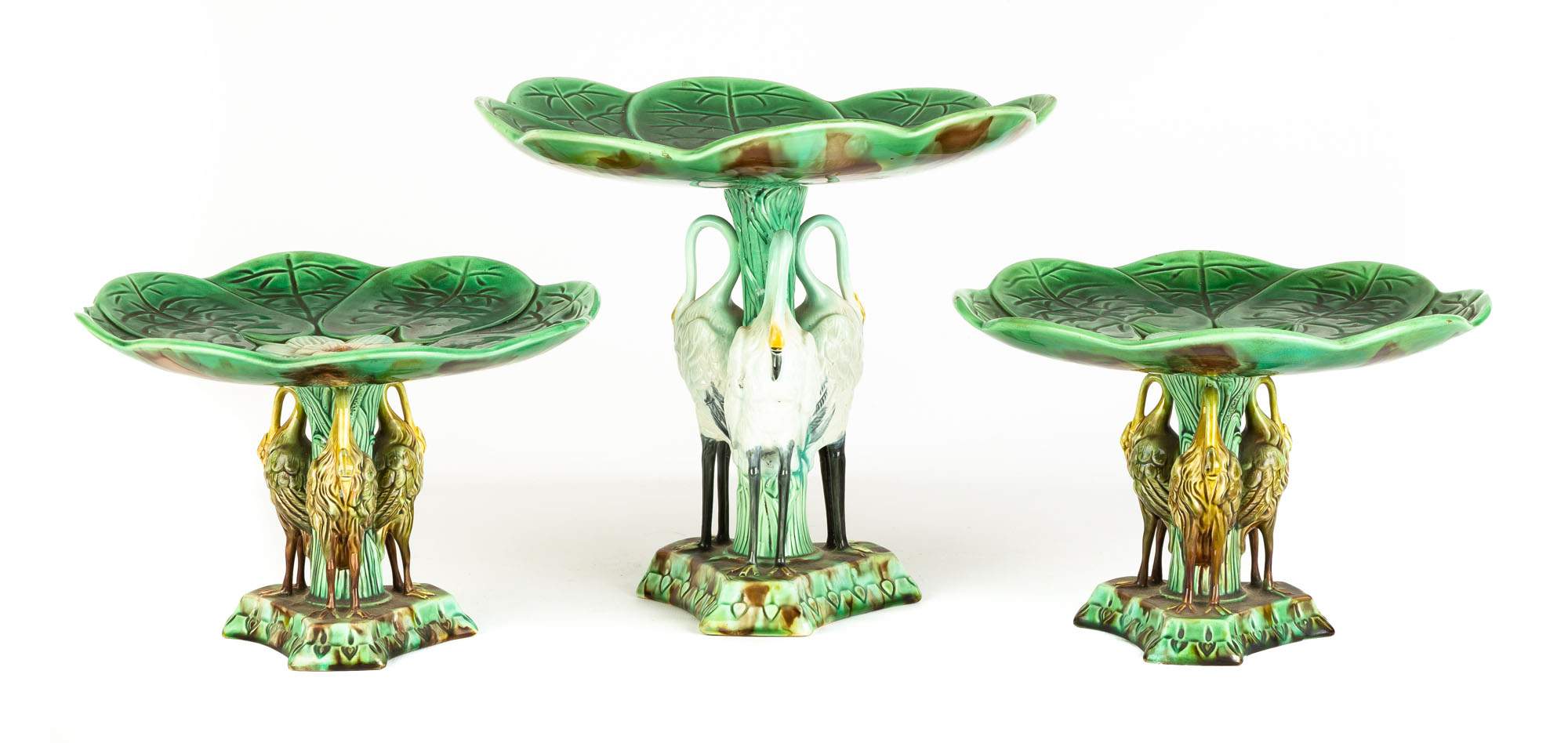 | Lot #: 42 Three Piece English Majolica Compote Set With Herons |