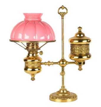 | 19th century. Burners marked 'Phoenix', with relief cast decoration. Pink ribbed shade. |
