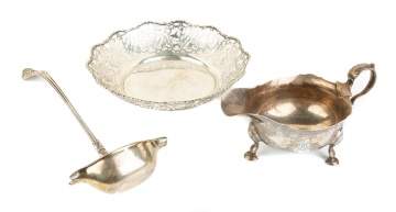 | Ladle: Whiting, L 14", 8.48 ozt. Gravy: Tiffany and Co., L 9", 12.75 ozt. Monogrammed. Bowl: Gebrfriedlander, 800 silver, reticulated border, D 10", 10.96. |