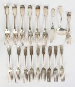 | 6 forks, 8 1/2". 9 forks, 7 1/2". 1 fork, 7". Ladle and butter knife. 42.5 ozt. |