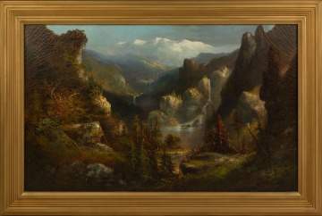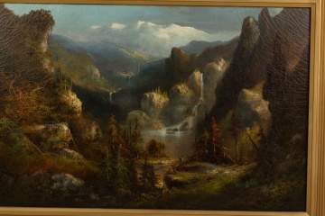 | Oil on canvas. Depicting waterfalls and Native Americans. |