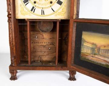 | Carved column and eagle crest. Mahogany case. 30-hour wooden works, time and strike. Original wood painted dial. Professionally repainted tablet. Good label. |