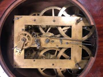 | Mahogany case in old finish. Original painted metal dial and lyre glass. Missing label. 8-day, time and strike brass movement. |