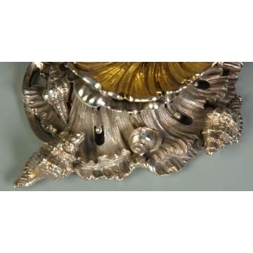 | 24. Charles T. Fox & George Fox, London, Pair of Sterling Master Salts, With shell form bowls, resting on wave w/conch shells, matching spoons. 23 oz. Ht. 2 1/4" W 5 1/2" Est. $800-$1,200 |