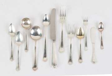 | (12) 7 1/2" spoons; (12) 5 1/2" spoons; (12) 4 1/4" spoons; (12) 5 1/4" spoons; (12) 6 1/2" spoons; (12) 5 1/2" spoons; (21) 6" spoons; (18) 7 1/2" forks; (18) 6 1/4" forks; (12) 5 1/2" forks; (18) 9 1/2" knives; (18) 5 3/4" knives. 143 ozt. |