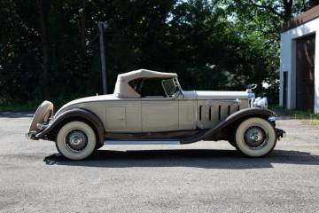 | (Mileage: 4,409) Tan/Cream Rumble Seat Roadster with Red Leather Interior. V-8 Motor, wind wings, canvas tire cover, five wire wheels, Goddess radiator ornament, auxilliary lights and rumble seat. Aftermarket dual chrome air horns and turn signals. Car was professionally restored in 1971-72 and received a 1st Junior at York, PA in 1972 and 1st Senior in 1973 . |