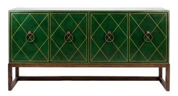 | 20th century. Green-marbled tooled leather with large brass ring pulls and diamond-pattern to door fronts. |