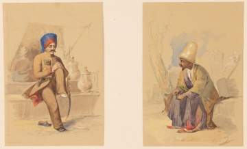 The collection of watercolours of Turkey and Egypt accomplished by two notable 19th century Orientalists artist, documenting a journey through the region by a French prince. Some of the watercolours depict views of Bosphorus, Therapia and other sites in and around Constantinople. The remainder depict scenes and costumes of Egypt. Both Beaumont and Preziosi were known as illustrators of travel books in the middle nineteenth century. The present watercolours and drawings were never published and constitute a valuable and exquisitely rendered documentary of the sites visited and local costumes of the period.