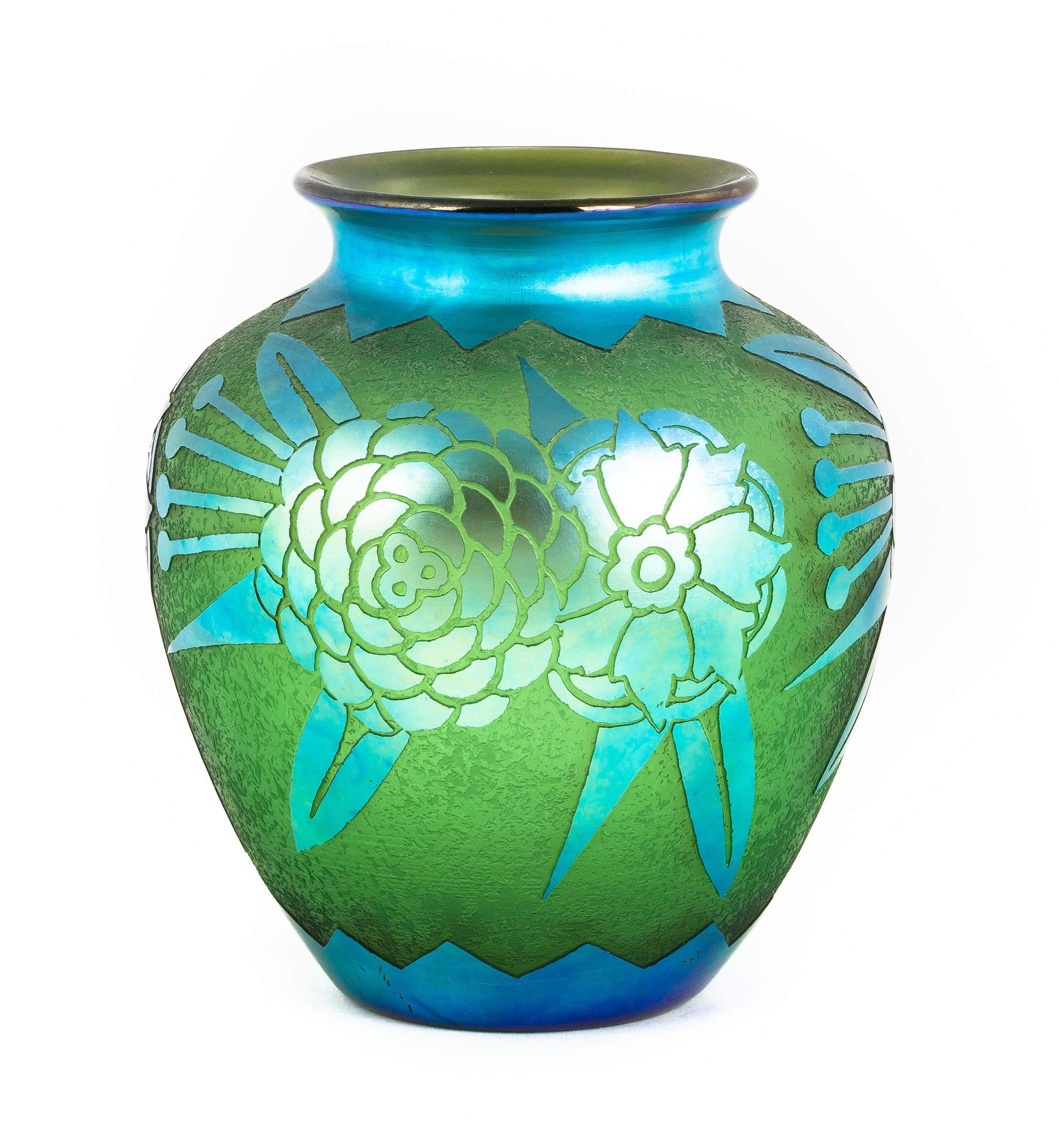 | Lot #: 66 Steuben Blue Aurene Over Pomona Green Acid Cutback Vase |