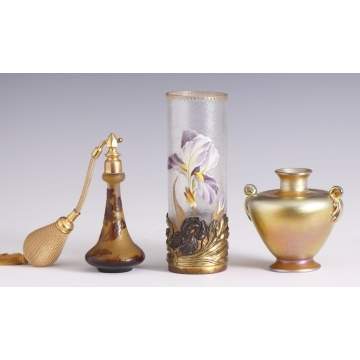 | Lot 24: Sgn. Galle Cameo Atomizer, Excellent. Ht. 6" Est. $600-$1,000 Lot 25: Mont Joye Art Glass Vase, Sgn. acid stamped Mont Joye. Acid cut back w/enameled iris mounted on bronze base. Excellent. Ht. 8" Est. $700-$1,000 Lot 26: Tiffany Gold Iridescent Vase w/Applied Handles, Sgn. LCT. Excellent. Ht. 4 1/2" Dia. 5" Est. $500-$800 |