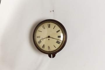 | Early 19th century. Original painted convex metal dial. Mahogany case with 8 day fusee movement. Verge escapement. |