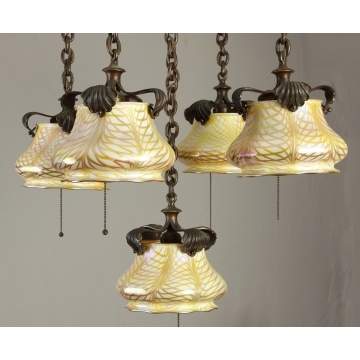 | Lot #: 60 Patinated Brass 5 Light Chandelier w/Quezal Shades |