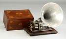 | Inlaid cabinet and rare "Ships Wheel" winding mechanism. |