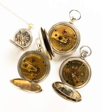 | Elgin hunter case, coin silver; Waltham key wind; Waltham key wind; Swiss coin silver pendant watch. |