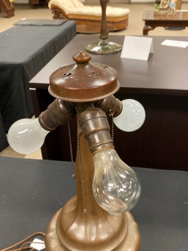 | Early 20th century. On bronze oriental base. Base stamped 'HANDEL'. Shade signed 'HANDEL 5664'. |