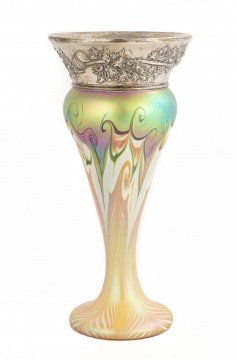 | With silver mounted top. Signed 'Quezal' (on bottom). |