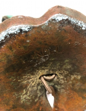 | With floral shaped leaded glass shades. Base signed 'Handel'. Brownish patina. |