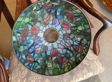 | Early 20th century. Leaded glass and patinated bronze. Shade impressed 'TIFFANY STUDIOS NEW YORK'. Base impressed '26536'. Reddish-green patina. |