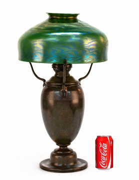Early 20th century. Favrile glass on patinated bronze oil lamp base. Greenish-brown patina. Burner impressed 'TIFFANY STUDIOS'. |
