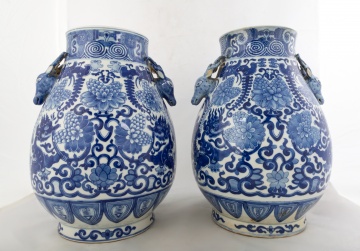 | Lot #: 28 Pair of Chinese Blue & White Porcelain Hu Form Vases with Deer Handles |