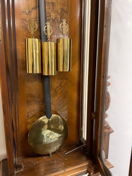 circa 1900. Carved walnut and burl case, possibly original finish. Signed porcelain dial, rare pull to wind and three weights. |