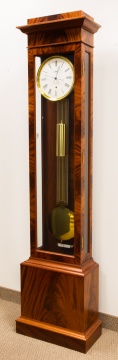 | circa 1975. Figured mahogany. Porcelain dial. Single weight driven movement. Month duration. Time only. |