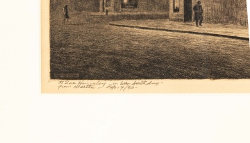 Drypoint printed in black on cream laid paper, McCarron 84. Edition of 99 recorded impressions. Illustrated American Etchers: Martin Lewis. Signed and dedicated 'To Sue Kingsley on her birthday - from Martin - Sept. 14, 1930' (lower left) 'Martin Lewis' (lower right). |