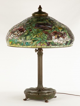 circa 1915. leaded glass and patinated bronze. shade impressed TIFFANY STUDIOS NEW YORK 1903. on a period bronze Tiffany Studios decorated Telescopic Library base with excellent brownish green patina. base impressed TIFFANY STUDIOS NEW YORK 367. Catalogue Note: This shade is listed in the Tiffany Studios 1913 price list as model no 1903 22" Peony, elaborate dome". By comparison with the more common 18" and 22" Peony shades, it would appear that this shade may depict a tree peony. This model was produced for a very limited time by Tiffany Studios (about 1913-1920) and its rarity and beauty make it a coveted piece today by collectors and decorative art lovers alike. The shade displays a stunning vibrant color palette. The blossoms range from deep rich reds & purples to a variation of light pinks. The background features a rainbow of colors from vibrant greens, blues, aquas, oranges and purples. |