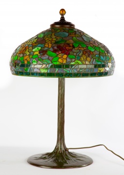 circa 1910. Leaded glass and patinaed bronze. Shade impressed TIFFANY STUDIOS NEW YORK 1506-16. Base impressed TIFFANY STUDIOS NEW YORK 553. Catalogue Note:The shade displays a natural palette of reds, oranges, yellows and blues with a translucent background and vibrant colors. With an exciting mix of striated, mottled and textured glass, the shade sits on a wonderful Tiffany Studios bronze sculptural “Tree Trunk” base. |