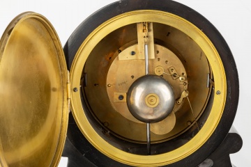 French, 19th century, porcelain dials with beveled glass bezels and outside escapement. moon phase calendar mechanism and barometer, with two tube mercury pendulum. |