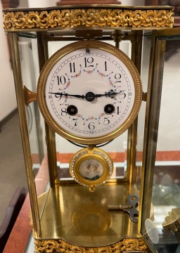 Hand painted porcelain dial, pendulum bob and beveled glass panels. Time and strike. |