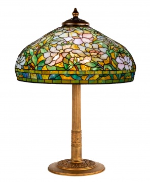 Early 20th century. leaded glass and patinaed bronze. Base impressed TIFFANY STUDIOS NEW YORK 629. Shade impressed TIFFANY STUDIOS NEW YORK The shade displays a warm and vibrant palette with pastel pink, white and yellow blossoms and green foliage with a amber confetti glass background. |