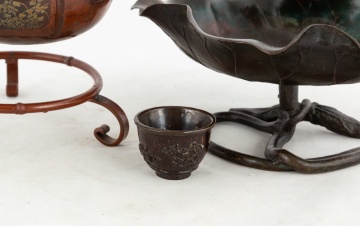 | Lot #: 306 Japanese Mixed Metal Teapot, Bronze Lotus Leave Bowl and Cup |