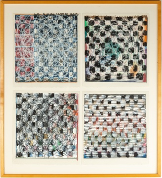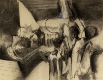| Lyn Horton (American, b. 1949), Mixed media on rag paper. Signed 'Horton '82' (on reverse). Overall 26 5/8 x 24 1/8 x 3/4 in. Gary Barker (American, 20th Century) "This Line Goes", Oil, pastel and charcoal. Signed 'Barker '82' (lower right). Overall 23 1/4 x 17 1/4 in. Julio Granda (American, b. 1932) Charcoal and white chalk. Signed 'J. Granda' (lower right). 26 1/4 x 31 1/4 in. |