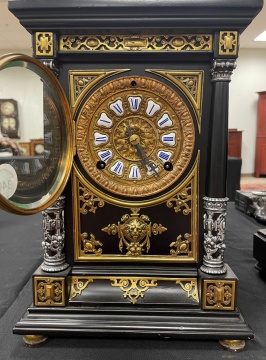 circa 1900, with ebonized case and metal mounts. 8 day time and strike. |