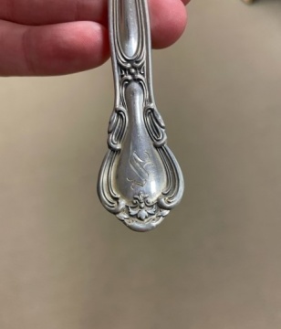 Chantilly pattern. 116 weighable ozt. 12 - 9 in knives. 12 - 7 in forks. 12 - 6 1/2 in forks. 2 - 8 1/2 in forks. 12 - 6 in knives. 24 - 5 3/4 in spoons. 4 - 8 3/4 in spoons. 12 - 6 1/4 in spoons. 12 - 5 1/2 in forks. 2 - 6 1/2 in ladle. 12 - 4 in spoons. 2 - 7 1/2 in spoons. 1 - 4 in tong. 1 - 9 in spoon. 1 - 5 3/4 in knife. 1 - 6 3/4 in knife. 2 - 6 in spoons. |