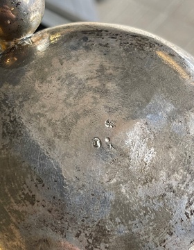 repousse with floral motif. Decorated throughout with embossed flowerheads and acanthus, with a large spherical thumbrest. Marks of Joachim Krumpholtz. 19 ozt. |