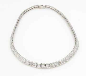 A platinum Riviera style necklace that is 15 inches long, is graduated in width and measures 6.4 mm wide at the center. It is "channel" set with a total of 154 straight baguette diamonds that measure approximately 22.00 cts, mounted length range 2.55 mm to 5.2 mm, mounted width range 1.8 mm to 3.0 mm, average mounted clarity VS-1 and estimated mounted color F-G. Total weight 55.4 grams. |