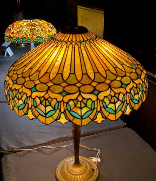| circa 1910. Leaded glass shade with an ormolu bronze base. Spider web decoration. Base impressed 'THE DUFFNER & KIMBERLY COMPANY - NEW YORK' with 'DKCO' Hallmark. A similar example can be found in Paul Crist's book "Mosaic Shades, Volume II," page 204. |